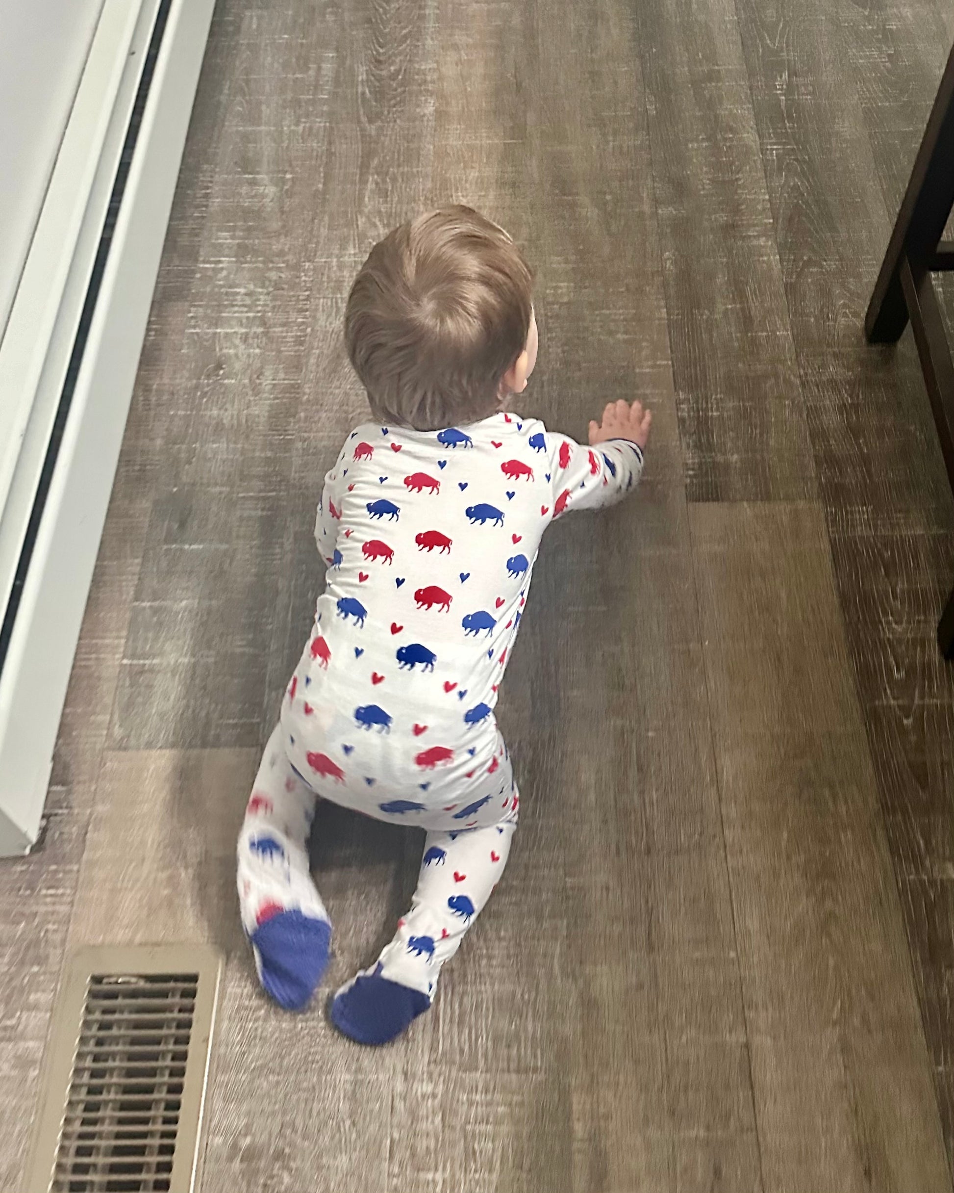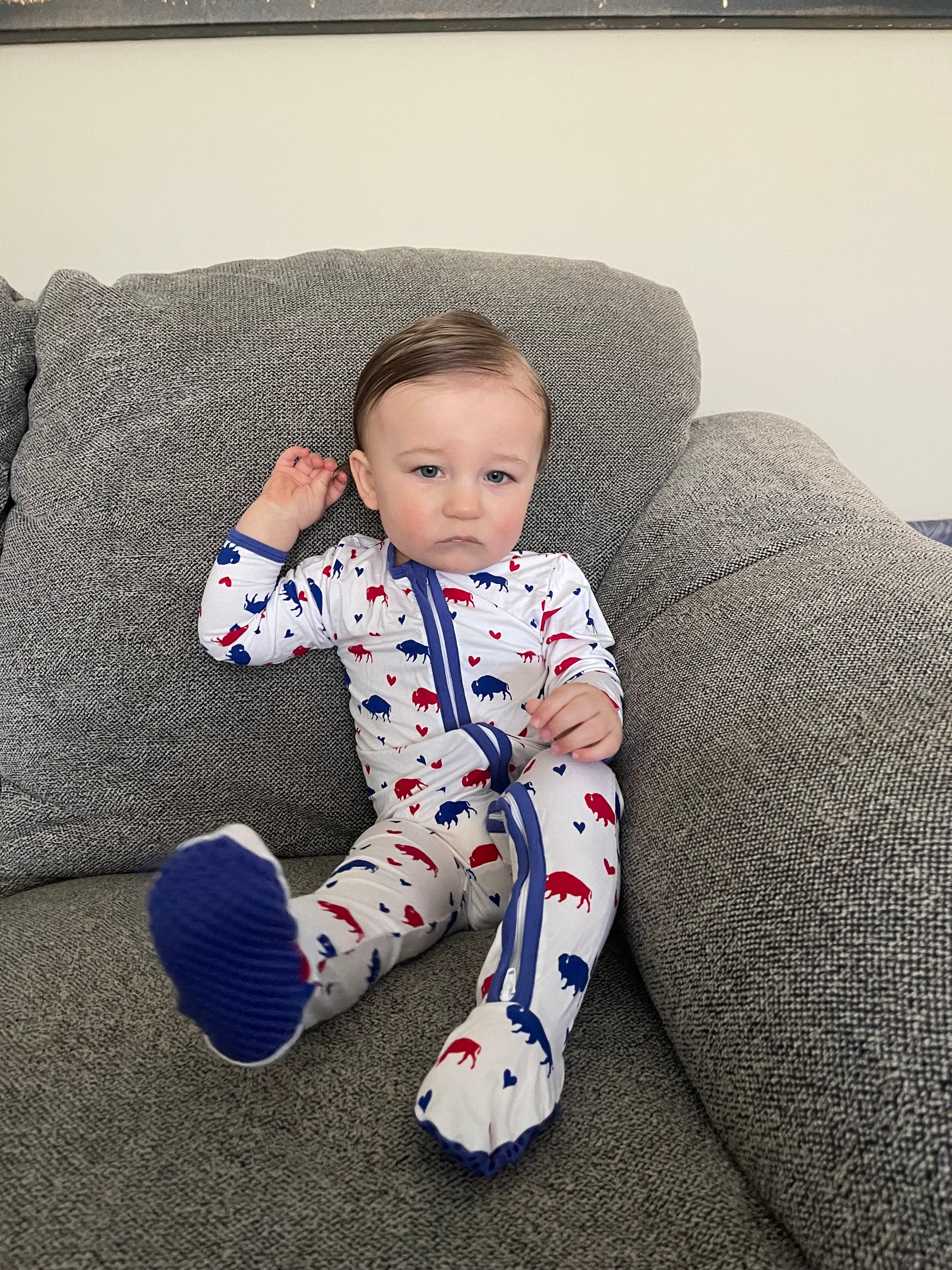 This soft red white and blue Buffalo Love romper pajama is just what your newest little Buffalo fan needs!!